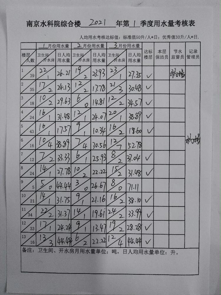 南京水科院综合楼2021年第1季度用水量考核表